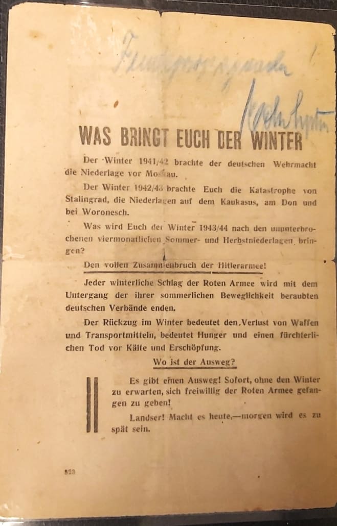 It´s laminated in plastic of a collector because the paper was of very poor quality. An officer have written Feindpropaganda – Propaganda from the enemy. He also signed it.