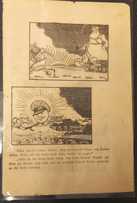 In this leaflet the Russians try to remember how hard the winter in 1941 – 1942 and the coming winter should be worse 1942 – 1943 for the German soldiers.